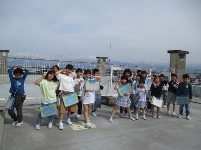 「わたしの家が見えたよ」「アピタは学校から南西の方角にあるんだね」「学校から東の方角に立山連峰がきれいに見えるよ」などと、気付いたことをワークシートにメモしました。そして、普段はなかなか見られない景色を友達と一緒に楽しみました。