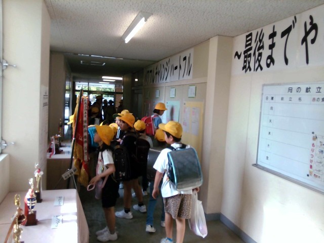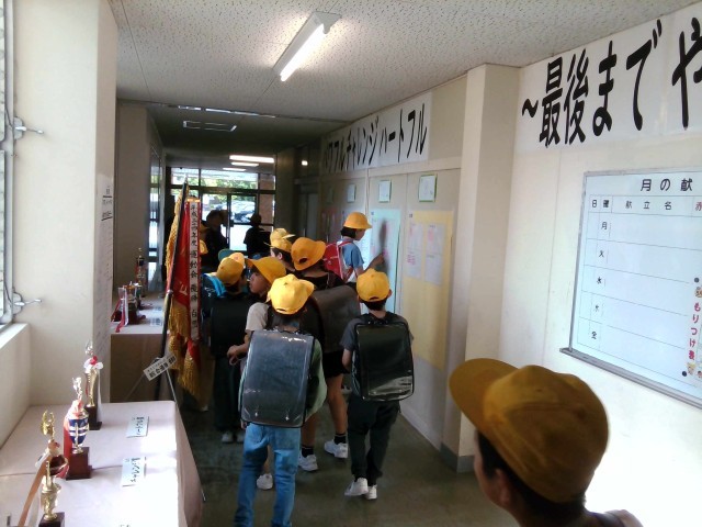 子供たちは、登校後に応援練習の得点掲示板を見に来ています。子供たちは、付箋に記された教員からの励ましの言葉や得点により、次の応援練習への気持ちを高めています。