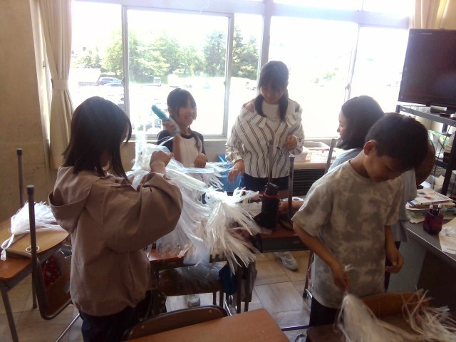 子供たちは、運動会の応援で使用するポンポンをつくっています。運動会まで残り2日となり、準備も大詰めです。