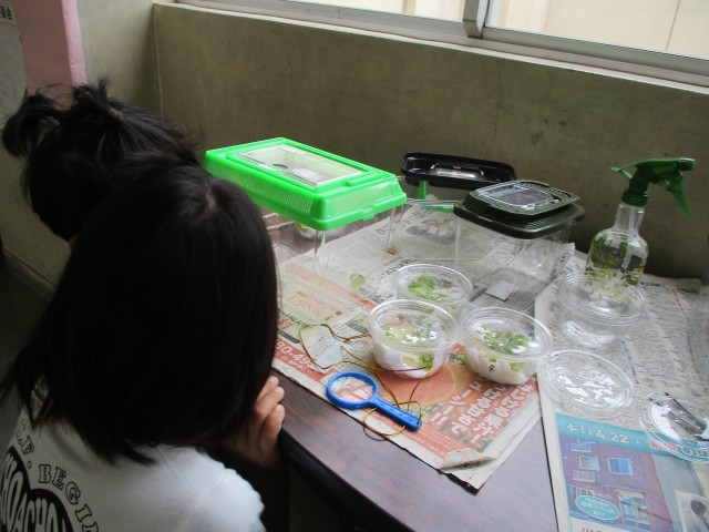 子供たちは理科の学習で、モンシロチョウのたまごから観察を続けてきました。初めは幼虫を見て「こわい」と言っていた子供たちも、毎日観察するうちに「かわいい!」「無事に大きくなってね」などと声をかけ続け、今週ついにさなぎから成虫になりました。