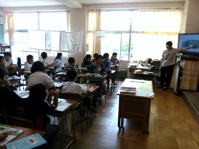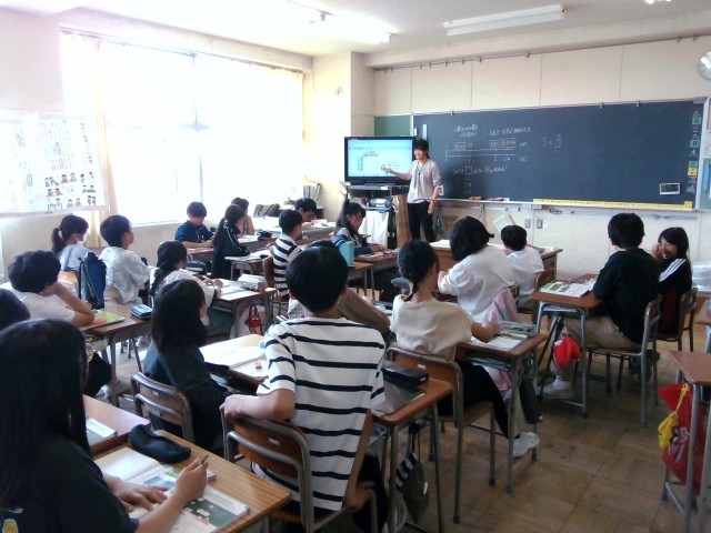 算数科では、分数をかける計算のしかたを学習しました。子供たちは、ノートに図や言葉を使って説明した後、友達と考えを交流しました。