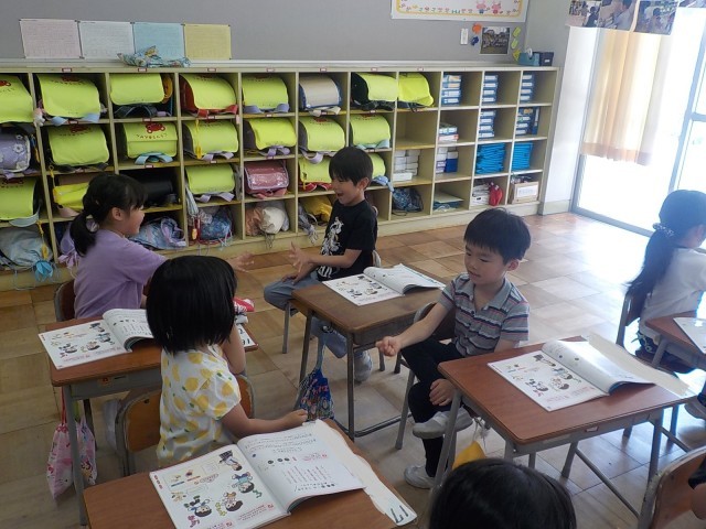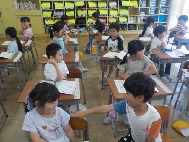 「じゃんけんぽん」の音楽に合わせて、歌を歌ったりカスタネットをたたいたりしました。また、ペアの友達とのじゃんけんを楽しみました。