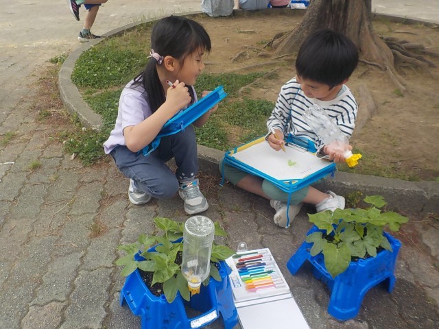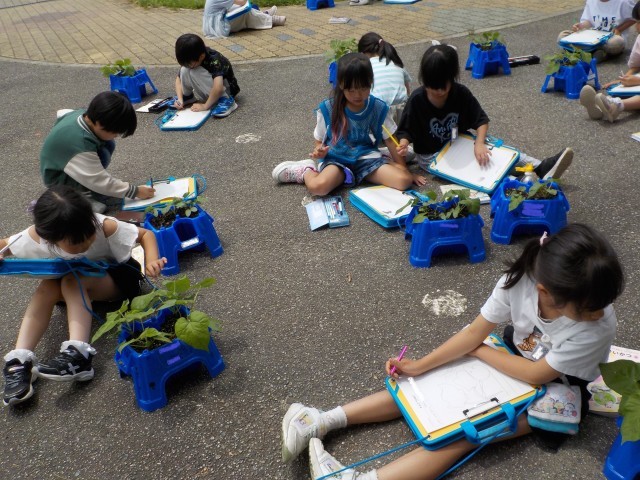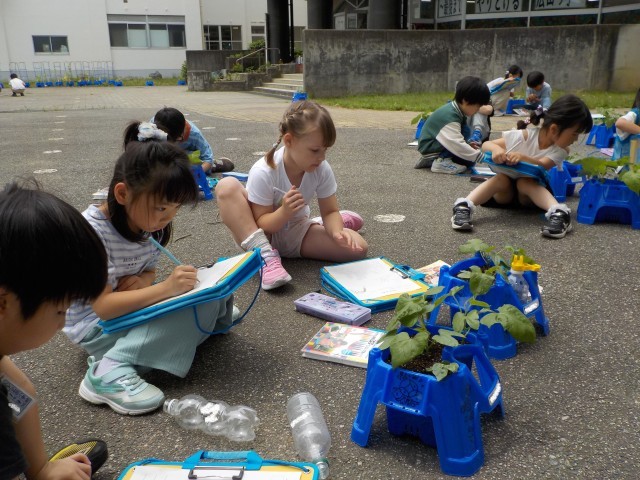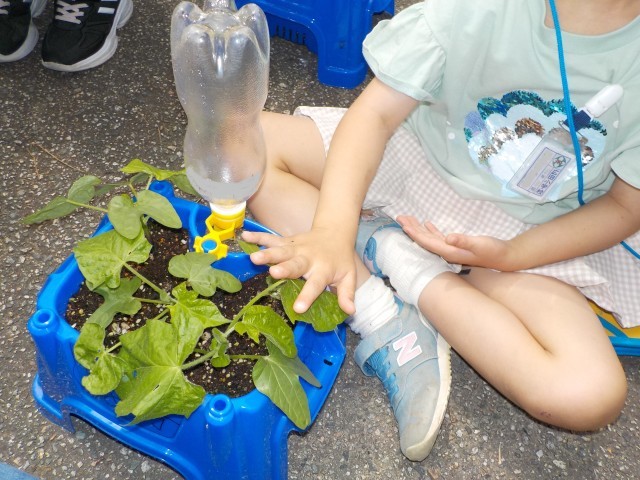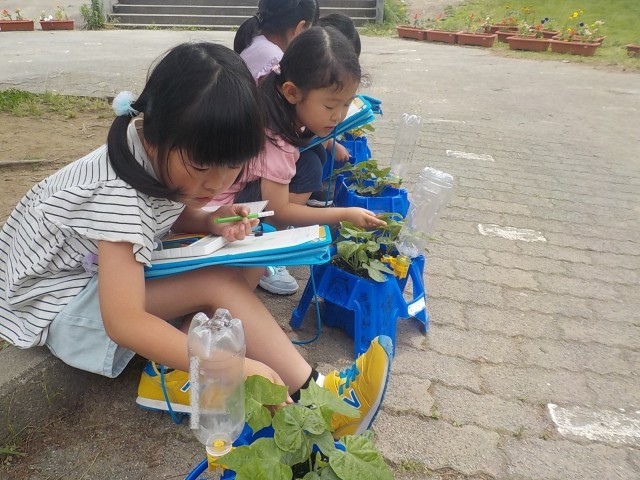 「葉っぱが手くらいの大きさだったよ」「さわるとふわふわしたよ」ぼく・わたしのあさがおがすくすくと育っています。