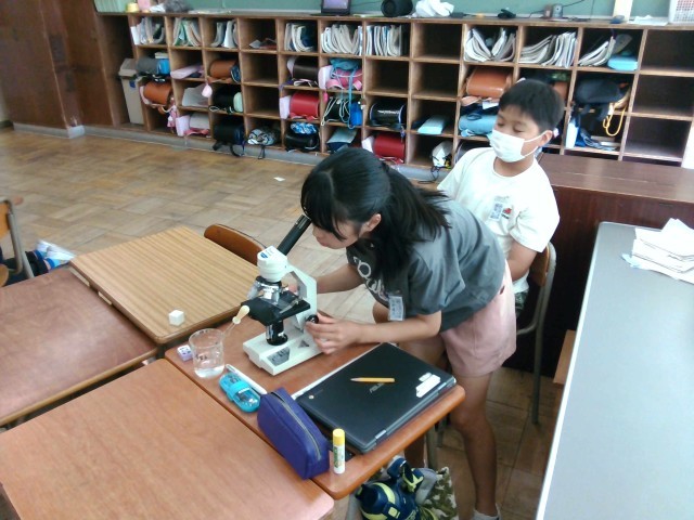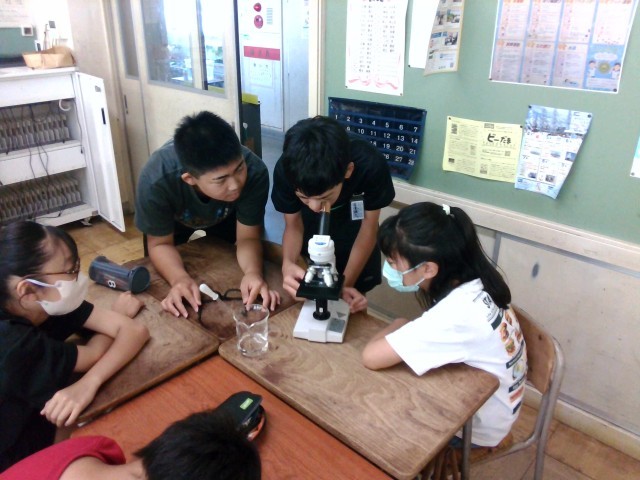 理科「生き物どうしのかかわり」の学習では、子供たちはメダカの水槽の水を採取し、顕微鏡で観察しました。子供たちは、「あ、動いている」と肉眼では見えない微生物を見付けて、感動を共有していました。