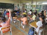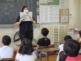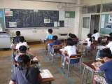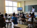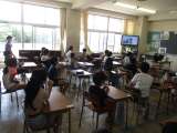 5年生がテレビ会議システムを使ってクイズ大会をしています。密にならない学年集会で...