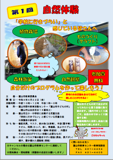 4月22日(金)に「学校に行きづらい」と感じている児童生徒を対象に、「富山市子どもの村『自然体験』」を実施します。