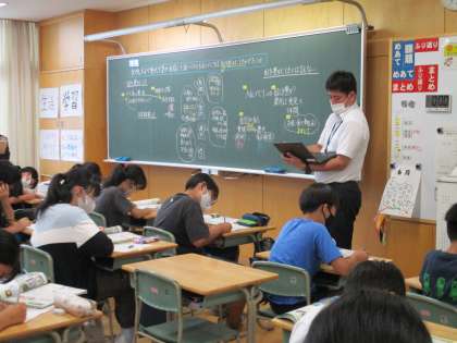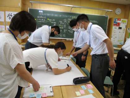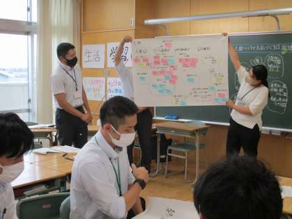 6月22日(水)6年次教職員研修会開講式・教科指導研修会1を豊田小学校で行いました。今回は、小学校の授業を、小中学校両方の先生方に参観していただき、小中学校の先生方が交流できる班編制で研究協議を行いました。中学校の先生からは、「小学校の学習内容を把握した上で中学校の授業を設計することが大切だと学んだ」、小学校の先生からは「教師が多角的な見方考え方をすることで、子どもの学びを広げることができると分かった」といった意見が聞かれました。