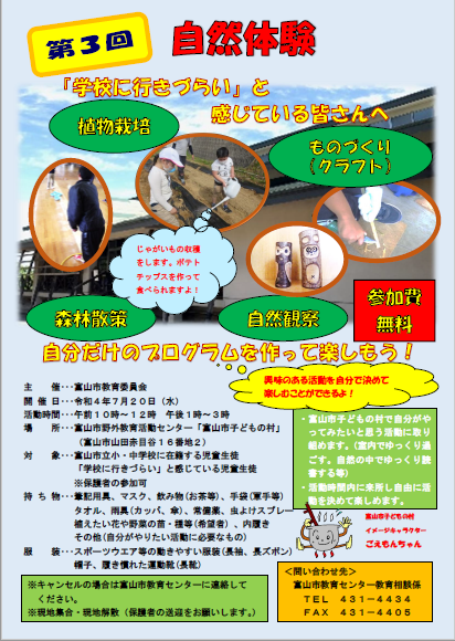 7月10日(水)に「学校に行きづらい」と感じている児童生徒を対象に、「富山市子どもの村『自然体験』」を実施します。これまでの活動では、花壇を作り、花や野菜の種を植えました。今回はじゃがいもの収穫をし、ポテトチップスなどを作って食べる予定です。参加者が自分の植えたい野菜や花の苗を持参し、一坪農園のような活動を行うことも可能です。今回の活動からの参加も大歓迎です。詳しくは富山市教育センター教育相談係へお問い合わせください。