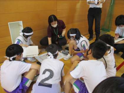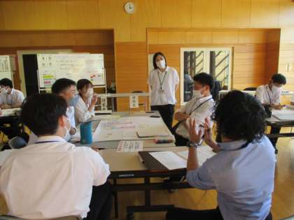授業後の研修会では、子どもの実態に合わせたルールをつくる大切さ、子どもが何をする時間かを理解し、自分たちで動くための細かな手立てのよさ、運動量を確保することの大切さなどについてグループ協議を行いました。グループ協議では、2年次教員が初任者をリードし意見をまとめたり発表したりする頼もしい姿が見られました。