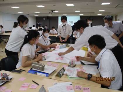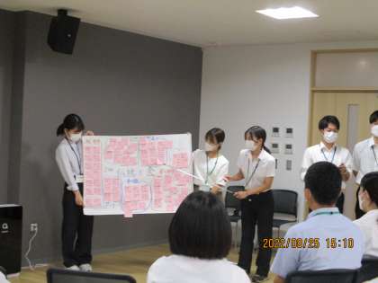 8月25日(木)第9回初任者・新規採用教員研修会「授業の基礎・基本3ー総合的な学習の時間についてー」を行いました。まず、先日実施した「市内見学『富山市の魅力発見』」について、各自が発見した富山市の魅力を出し合い、共有する活動を行いました。班活動では、同じ場所で魅力を発見しても、それぞれの見方や感じ方があることに気づき、さらに深く富山市の魅力をとらえていきました。各班でまとめたことを伝え合う場では、どの班も工夫やアイディアを生かして堂々と発表していました。
