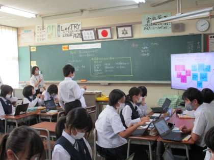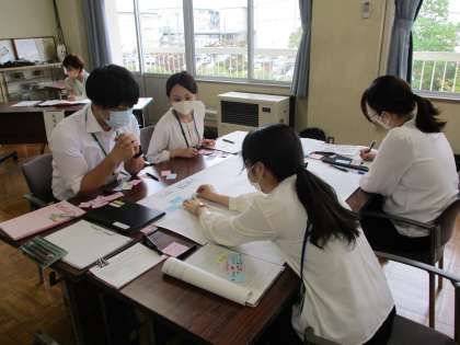 10月4日(火)興南中学校にて、2年次教員研修会、初任者研修会(授業研究)を行いました。10名の2年次教員、初任者教員が参加し、1年家庭科「持続可能な食生活」の授業を参観しました。生徒たちは、食品ロスを減らすためにはどうしたらよいか、「食べ方の工夫」「買い物の工夫」「その他の工夫」等について自分たちができることを考え、話し合いました。