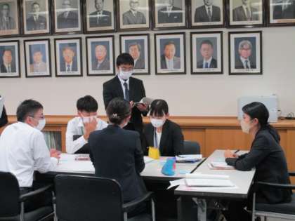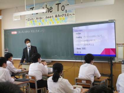 10月6日(木)城山中学校にて、2年次教員研修会、初任者研修会(授業研究)を行いました。10名の2年次教員、4名の初任者教員が参加し、2年英語科「Unit4 Homestay in the United States」を参観しました。生徒たちは「have to」「must」等の表現を用いて自分の考える校則を書き表し、グループで紹介し合っていました。