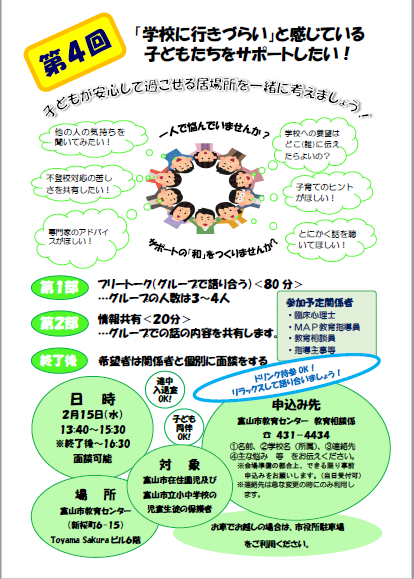 第4回「『学校に行きづらい』と感じている子どもたちをサポートしたい!」を行います。前回同様フリートークの時間を20分間長く設定します。内容はリーフレットの通りです。これまでに参加された方も是非、気軽にご参加ください。
