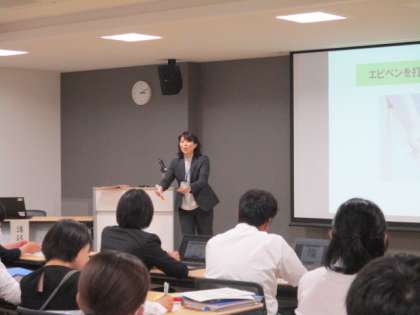 前半は、「学校事故の予防と対応」「学校における食物アレルギーの実態と対応」についての講義をとおして、学校管理下における事故の例から、日常の危機管理、安全点検に努めるなど教員が危機管理意識を高くすることで、多くの事故を防ぐことができるということを学びました。また、食物アレルギーについては、日ごろからの給食指導を徹底して、食物アレルギーをもつ子どもが間違ってアレルゲンを口にしてしまうことがないよう十分気をつけていく重要性を学びました。後半は「不登校対応」についての講義をとおして、子どもを理解しようと努めることや子どもの心に寄り添うことの大切さについて学びました。