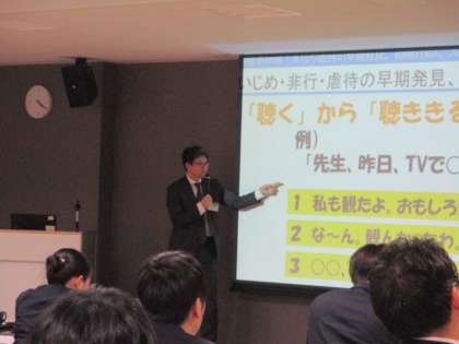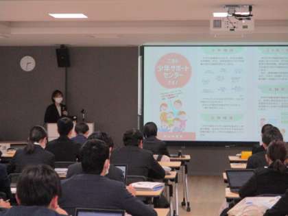 次に、学校教育課主幹指導主事より「いじめ、非行や虐待の早期発見、初期対応について」と題して講義を行いました。受講者は、いじめや非行、虐待とはどのような状況なのかをとらえ、「子どもたち自身が『いじめ防止』の意識を高め、自己有用感をもつことができるようにすること」「子どもの様子を観察し、見守り、多方面から子どもの変化をキャッチすること」「いじめや非行、虐待対応は一人で抱えこまず、学校全体で情報を共有し、対応すること」などを学びました。受講者は、子どもや保護者との信頼関係を大切にするために、話をよく聞くこと、よさを伝えること等、今後自分自身が心がけることを考えました。(担当:研修係)