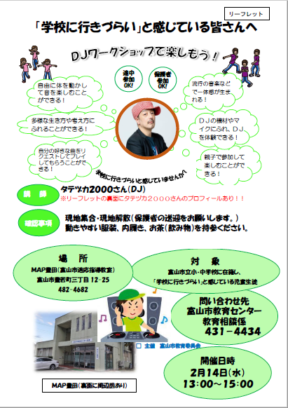 2月14日(水)に「学校に行きづらい」と感じている児童生徒を対象に、「DJワークショップ体験活動」を実施します。