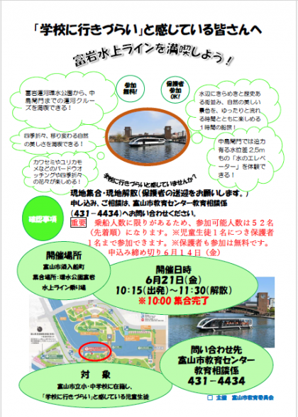 6月21日(金)に「学校に行きづらい」と感じている児童生徒を対象に、「富岩水上ライン乗船体験」を実施します。富岩水上ラインの乗船体験を通して雄大な自然や歴史的建造物にふれることで豊かな情操を育むことを目的としています。乗船人数に限りがあるため、参加可能人数は52名(先着順)になります。児童生徒1名につき保護者1名まで参加でき、乗船も無料です。詳しくは富山市教育センター教育相談係へお問い合わせください。