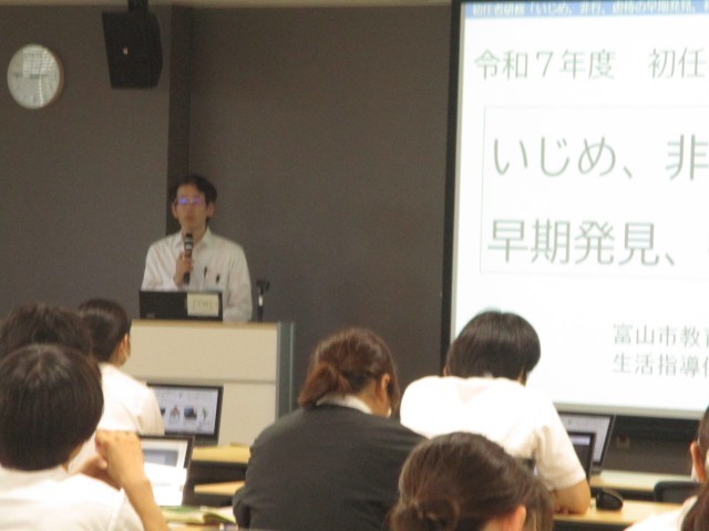 後半は、学校教育課主幹指導主事より「いじめ、非行や虐待の早期発見、初期対応について」と題して講義を行いました。受講者は、「学校生活の中で、子どもが自己有用感を高められるようにすること」「子どもの様子を多方面から子どもの変化をキャッチすること」「学校全体で情報を共有し、対応すること」などを学びました。