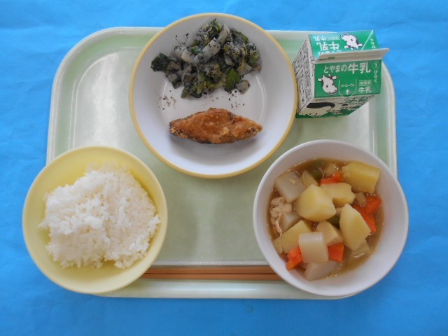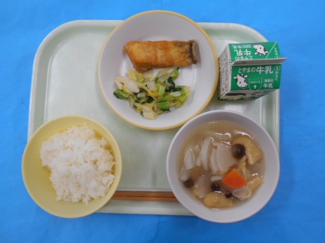 きょうのメニューは、ごはん、ぎゅうにゅう、ほうとうなべ、ゆずあえ、...
