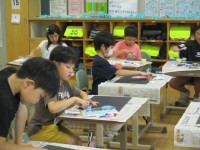 図画工作科では、彫刻刀を使った版画に取り組みます。自分が会いたい動物の毛並みや...