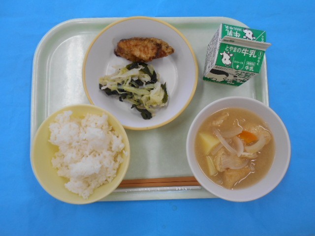きょうのメニューは、ごはん、ぎゅうにゅう、みそしる、すのもの、ふくらぎのかばやきです。あまからいたれがふくらぎのあじわいをいっそうひきたて、とてもおいしくいただきました。
