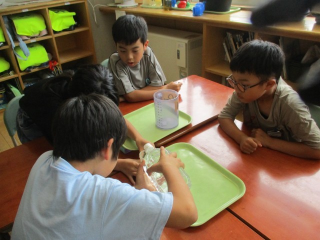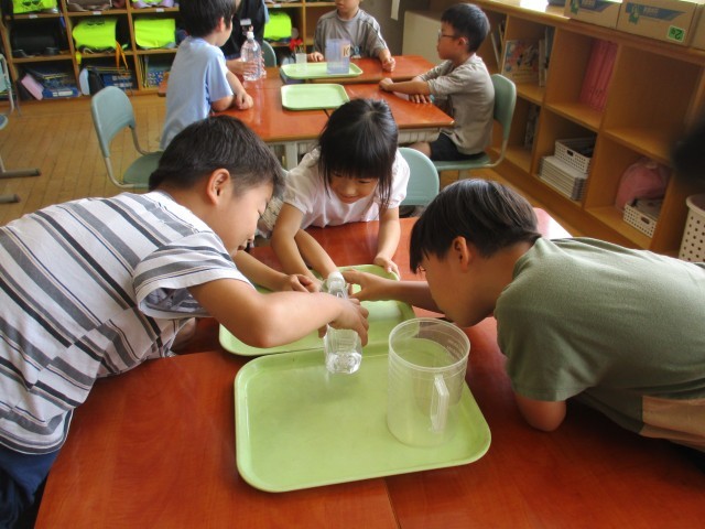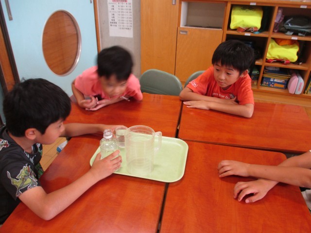 「水のかさ」の学習では、リットル升、デシリットル升等を使って、実際に水を測りながら学習をすすめました。子供たちは正しく計測しようと、目盛りを間近で確認したり、水を注ぐ友達に声をかけたりしていました。