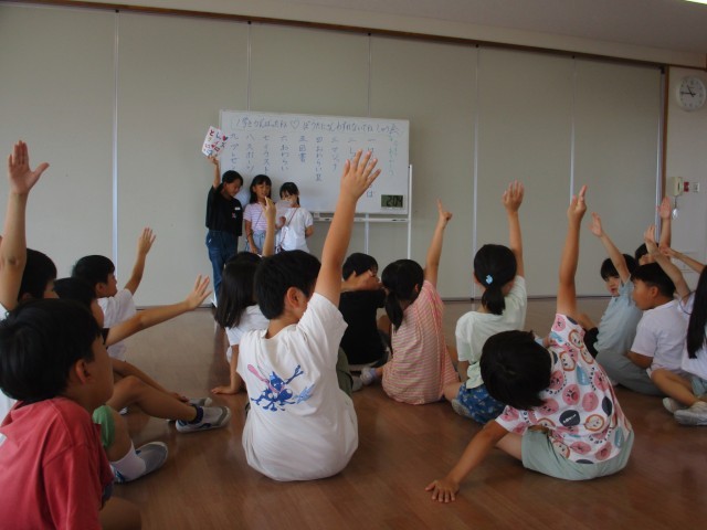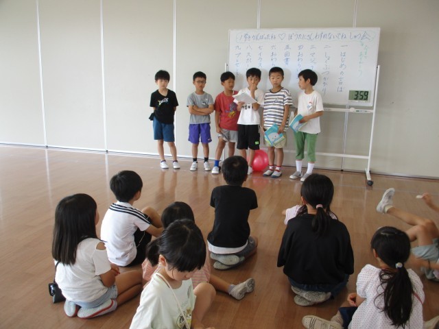 1組では「1学期がんばったね集会」を行いました。子供たちが集会名や活動内容を決めて、進んで計画や準備を進めることができました。今日は、1学期で転校する大切な友達とのお別れ会も兼ねて、みんなで楽しい思い出をつくることを目標に取り組みました。笑顔あり涙ありの温かい集会になりました。