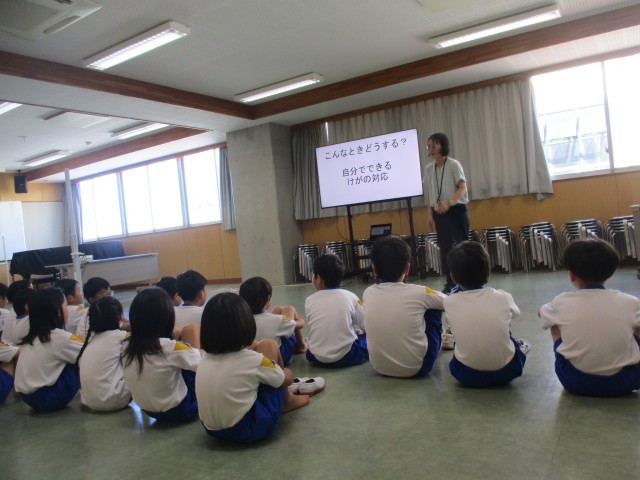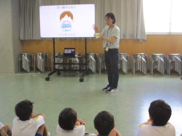 身体測定が行われた際に、養護教諭から「自分でできる応急処置」について学びました。鼻血が出た際や転倒した際に、できるだけ早急に自分で行動することで、悪化を防いだりその後の治療をスムーズにすることにつながったりすることを知りました。
