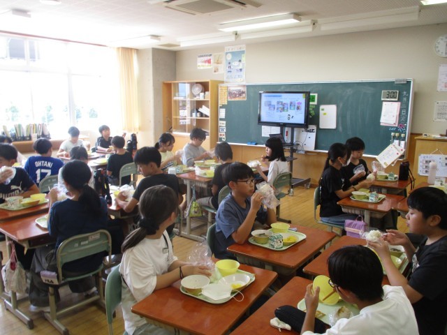 今日の給食では災害が起きたときを想定して、食器や手を汚さずに自分でおにぎりを作ったり、日持ちしやすい食材で調理されたものが出たりしました。災害時に水が重要なものになることから、なるべく汚さないようにするなど、食べ方に気を付ける姿が見られました。