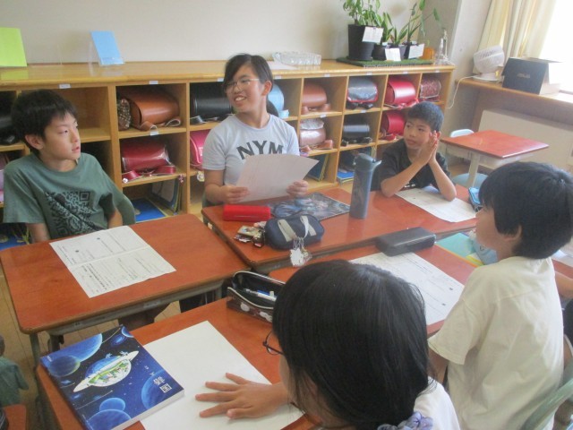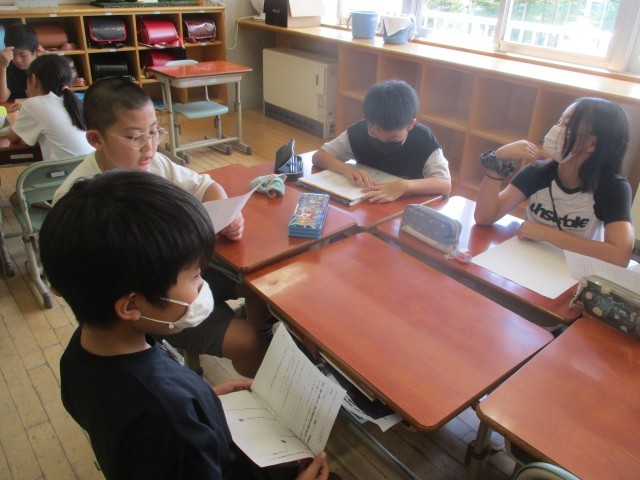 国語科の「どちらを選びますか」の学習では、「一度だけ行けるなら、過去と未来のどちらを選びますか」のテーマで対話をしました。説得力をもたせるために、理由を分かりやすく伝えたり質問に対して適切に答えたりしました。