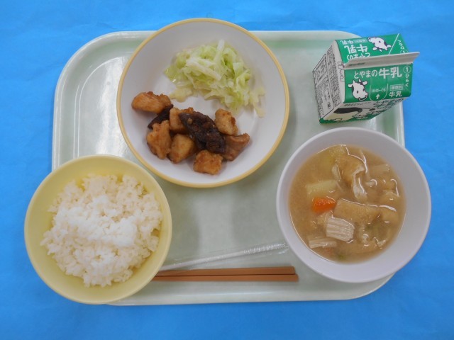 この日のメニューは、ごはん、ごもくみそしる、ぎゅうにゅう、そえやさい、とりにくとレバーのあまからめでした。