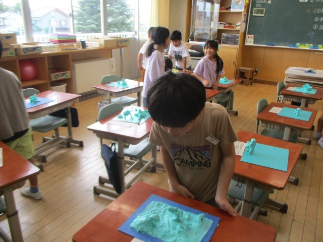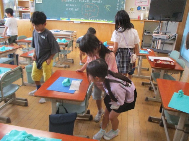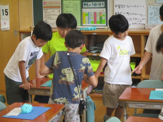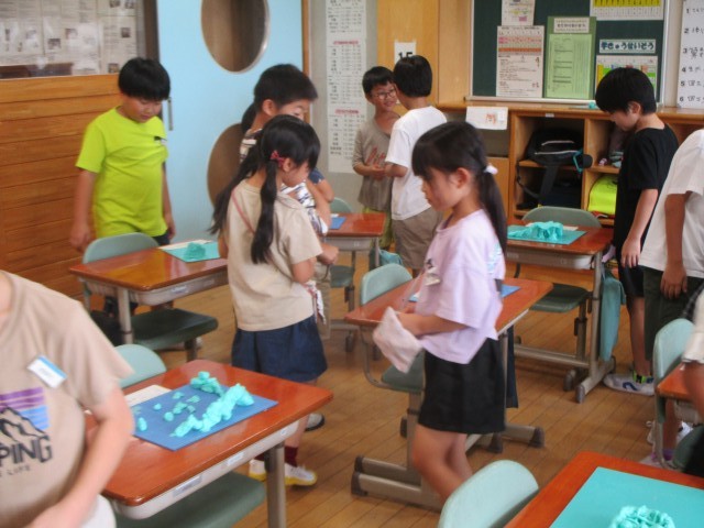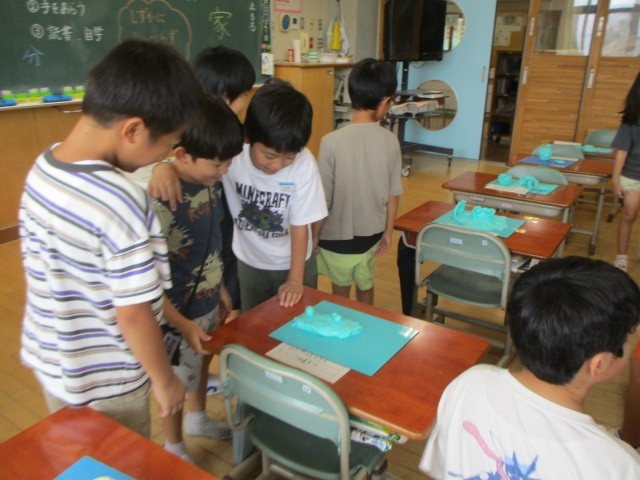 夏休みの思い出を形にした作品の鑑賞会を行いました。「リアルにできている!」「何をしたのか分かりやすい」など、友達の作品のよさについて伝え合うことができました。