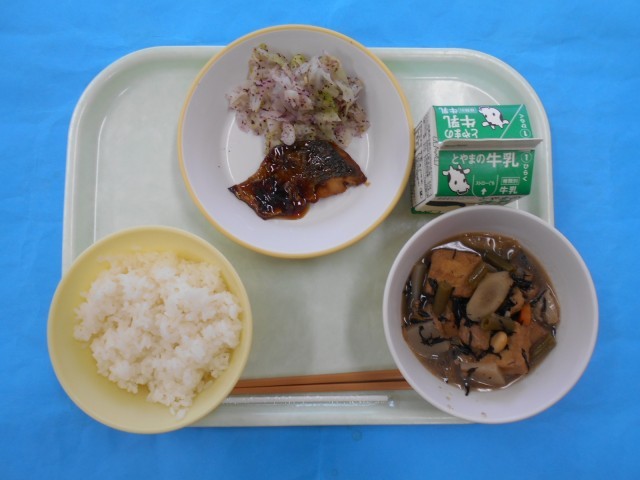 きょうのメニューは、ごはん、だいずのいそに、ぎゅうにゅう、ゆかりあえ、あじのみりんやきです。あじのみりんやきは、あじのうまみをたっぷりとあじわいました。