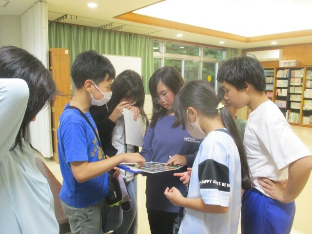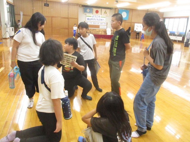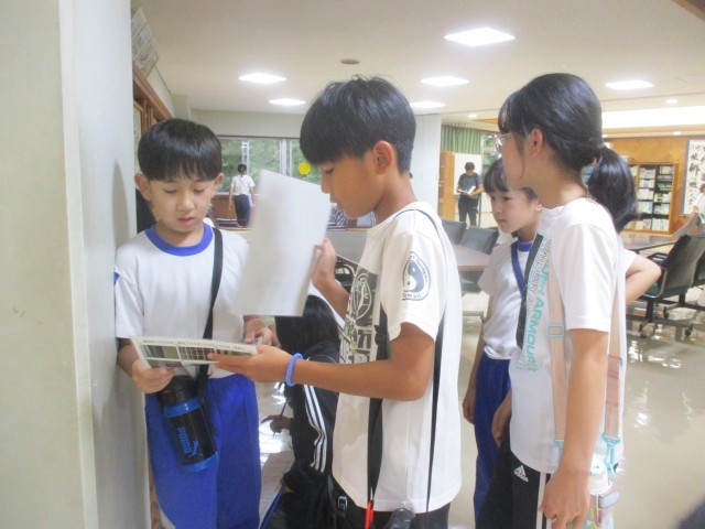 1日目の午後は、雨のため館内フォトオリエンテーリングに変更しました。館内にちりばめられたマークを探します。手元にある写真を手掛かりに探しますが、マークが小さいためなかなか見つけにくかったですが、話し合って協力して見つけていました。