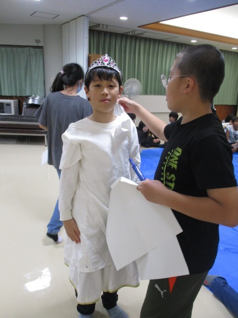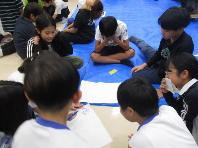 1日目の最後の活動は、雨がまだまだ続いていたので、キャンドルサービスに変更しました。活動リーダーが前日まで練習を繰り返していたおかげで、燭台を囲んで素敵なキャンドルサービスになりました。ゲームでは「お絵描き伝言ゲーム」を企画し、班で協力しながらお題の絵を完成させていました。