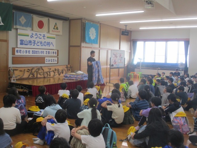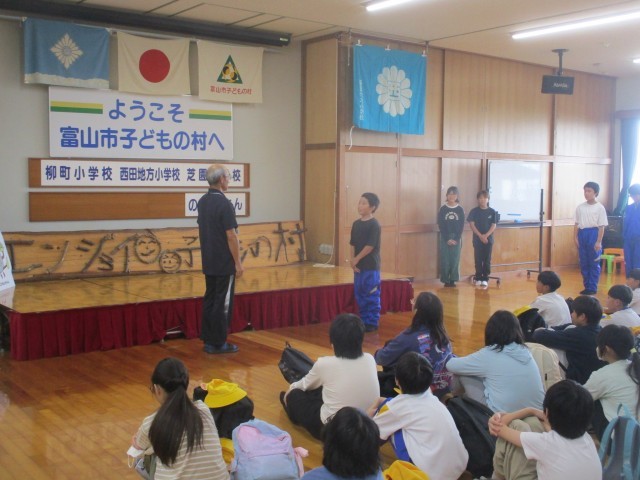 富山市子どもの村に到着してから、入所式を行いました。お世話になる所の方に、目当てや楽しみにしていることを伝えました。普段の生活とは違う環境で過ごすことに不安がありつつも、わくわくしている子供たちの様子が見られました。オリエンテーションでは、所の方の話を真剣に聞き、所でのマナーやルールについて確認しました。
