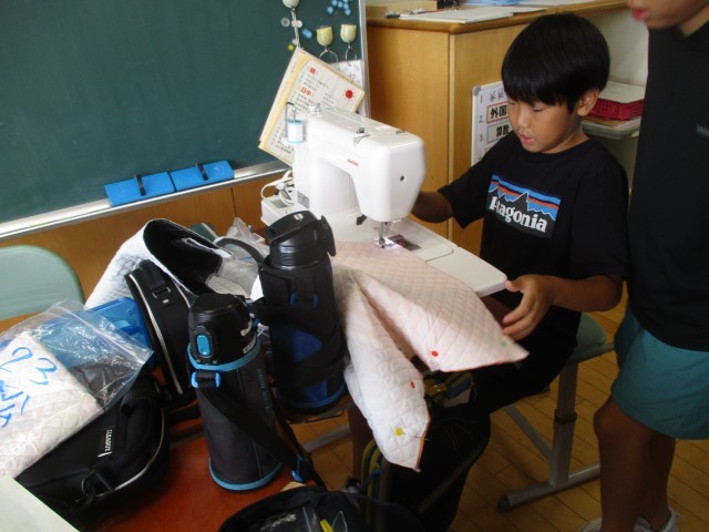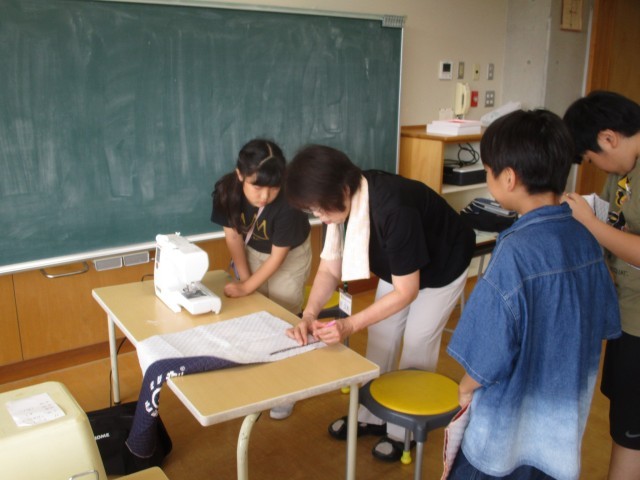 家庭科では、ミシンを使ってトートバックを作っています。バックのイメージに合わせた飾りをつけたり、名前を縫い付けたりするなど、完成を楽しみに作業を進めています。