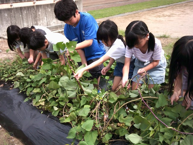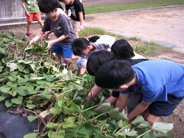 前回のつる返しから、つるが根付き始めたので、再びつる返しを行いました。地面の下は見えませんが、さつまいもがたわわに実ることを願っています。