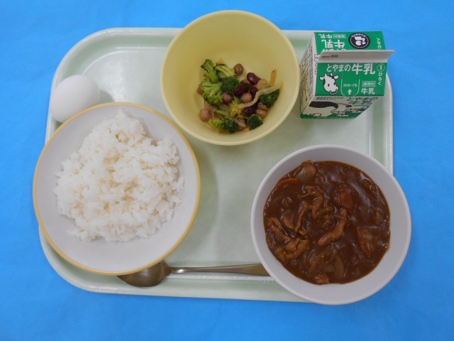 きょうのメニューは、ハヤシライス、ぎゅうにゅう、ビーンズサラダ、ゆでたまごです。なぜ、ハヤシライスというのかというと、ハッシュドビーフからきたせつ、はやしさんというひとがかんがえたせつと、きゅうしょくいいんがおひるのほうそうでおしえてくれました。