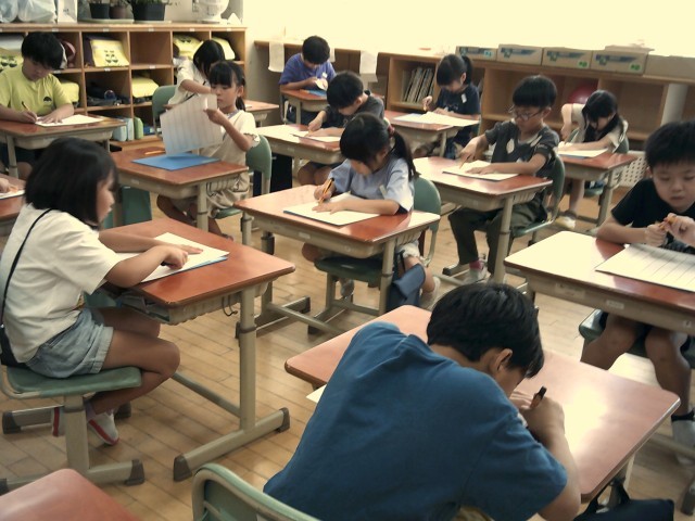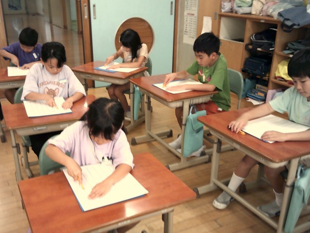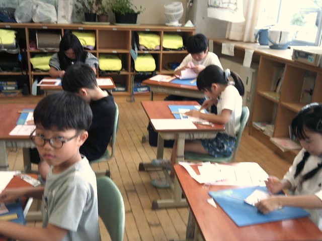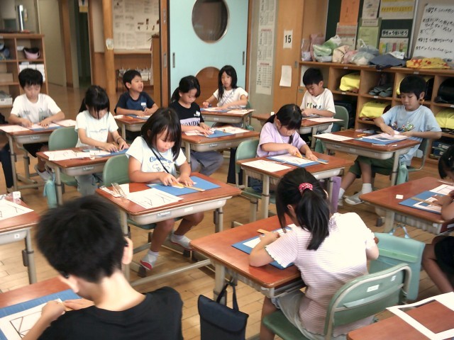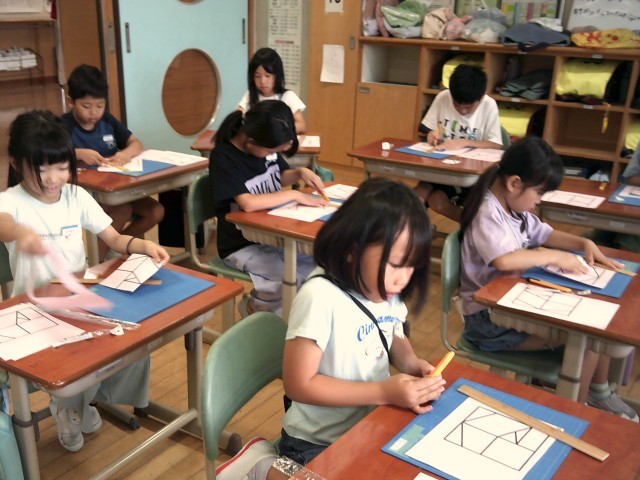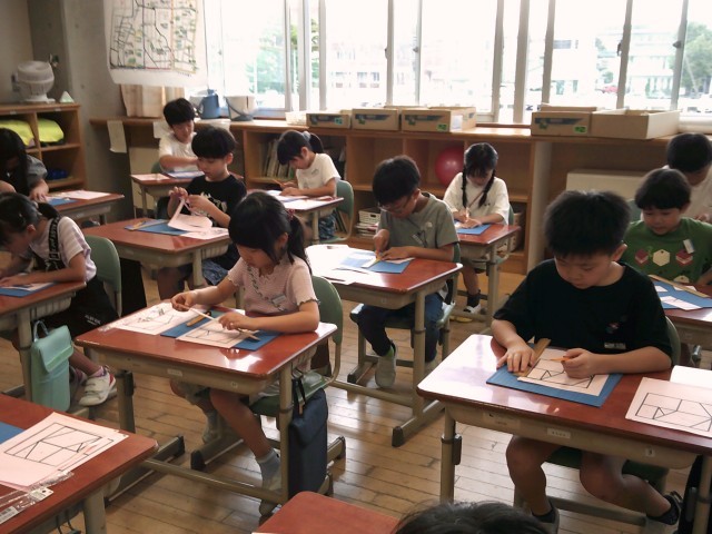 図画工作科では、カッターの使い方を学習しました。安全に気を付けて、線にそって紙を切りました。翌日には、学習したことを生かして、算数科の学習で使う図形を切りました。
