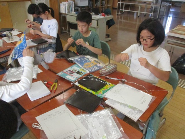 図画工作科では、針金を使って不思議な植物をつくります。「折る」「曲げる」「よじる」等の針金の技法を活用しながら、自分の表したいものを表現していました。