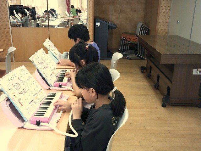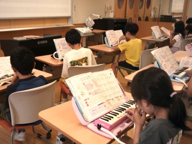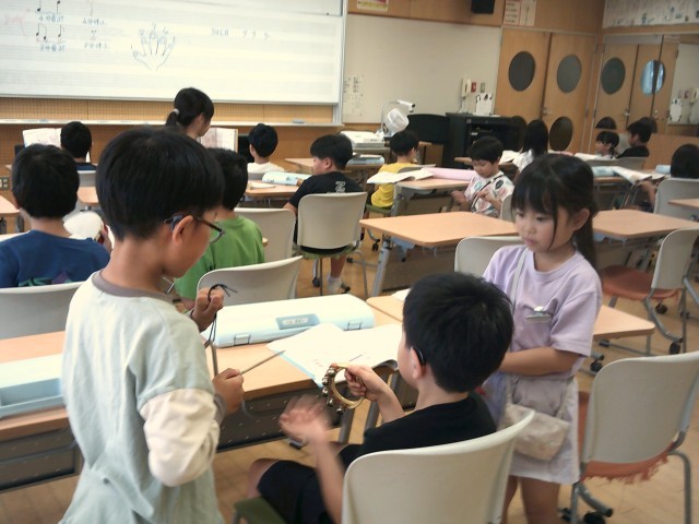 3人一組になって、鍵盤ハーモニカや打楽器のリズム打ちを練習しています。リズム打ちでは、3人それぞれが異なるリズムを重ねて打つので、お互いにつられないように一生懸命に練習に取り組んでいます。