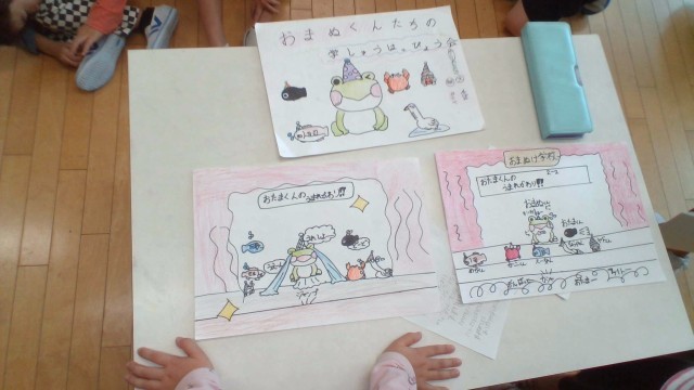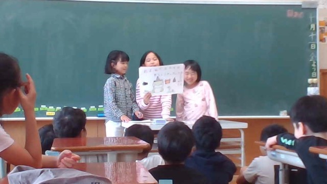 本日の読書タイムに、イラスト係さんが自作した紙芝居の読み聞かせを行いました。学習発表会を応援する内容になっていて、クラスのみんなは引き込まれていました。