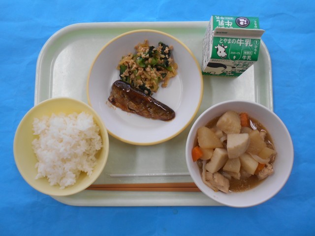 きょうのメニューは、ごはん、ぎゅうにゅう、とりにくとさといものごまに、なっとうあえ、いわしのうめにです。さといもにしっかりとごまふうみのあじがしみて、とてもおいしかったです。