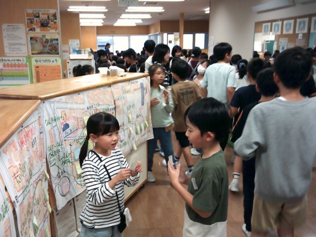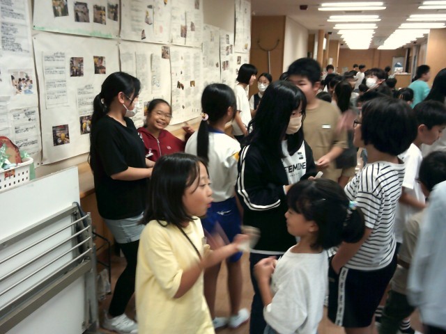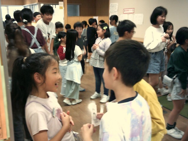 自分が持つ絵カードと同じものを持つ相手を探すゲームが、全校で行われました。相手を探そうと、絵につながるヒントになる言葉を考えたり、大きな声で言いながら探し歩いたりしました。