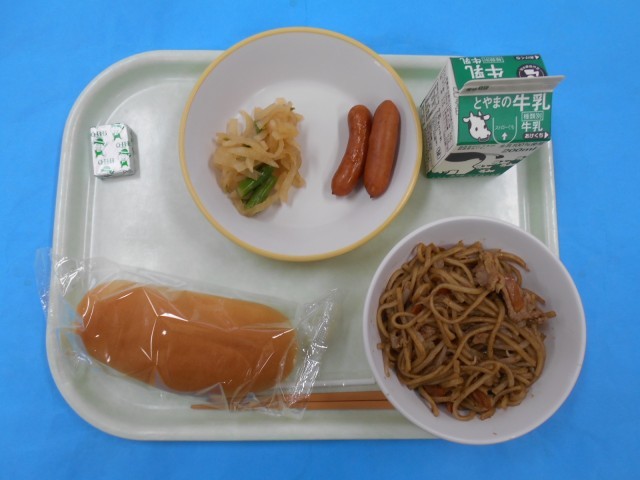 きょうのメニューは、げんりょうコッペパン、ぎゅうにゅう、やきそば、だいこんサラダ、あらびきウインナー、ポケットチーズです。こどもたちはやきそばをパンにはさむなど、おもいおもいにいただいていました。