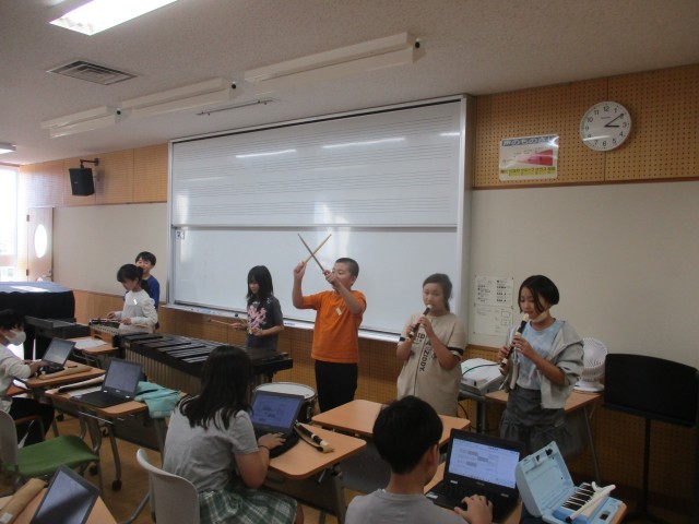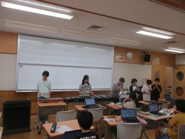 音楽科では「リボンのおどり(ラバンバ)」の合奏の発表をしました。発表に至るまでリズムやメロディーラインに着目し、それぞれのパートの特徴に合った楽器を選び練習を重ねてきました。グループごとに楽器の重ね方や速さを工夫し、すてきな演奏会になりました。