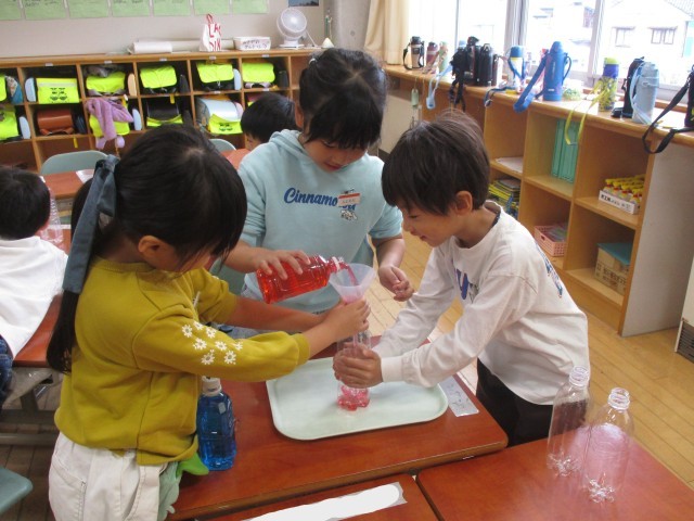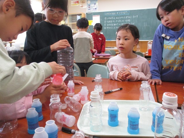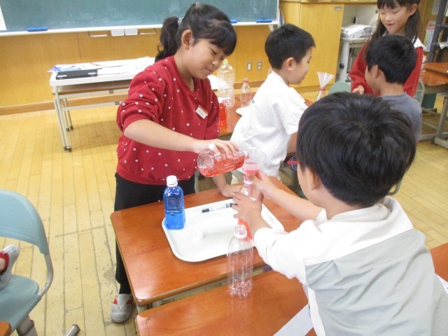 子供たちは、前回立てた予想をもとに、どちらのペットボトルの水が多いのかを確かめました。より大きなペットボトルに移し替えたり、小さなペットボトルを何個も使って移し替えたりして、どちらが多いのかを確かめることができました。