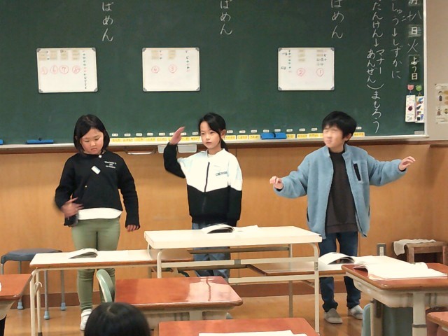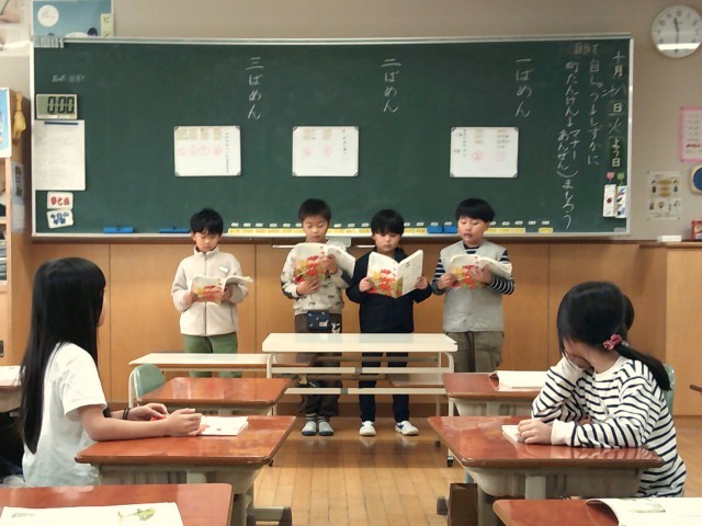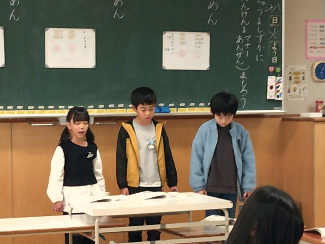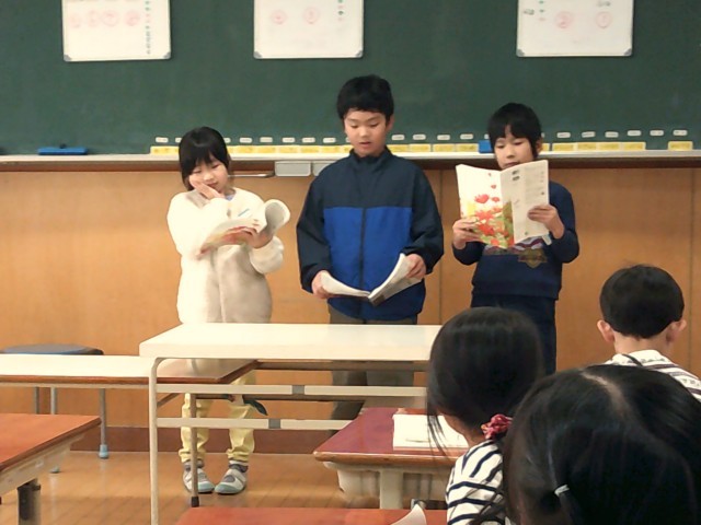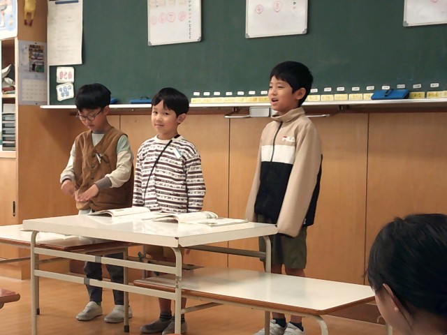 「お手紙」の音読発表会を行いました。場面の内容から登場人物の気持ちや様子を想像し、つぶやきや身振りを加えるなどして、感情豊かに音読しました。