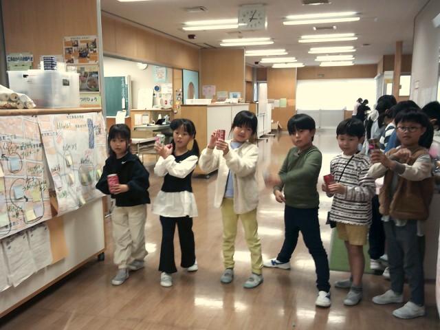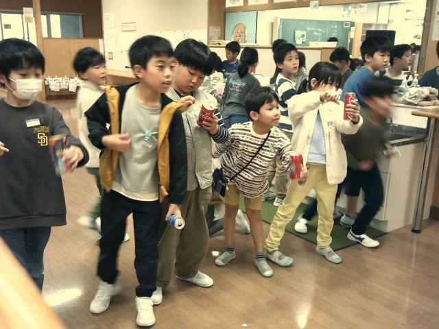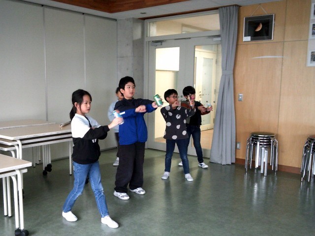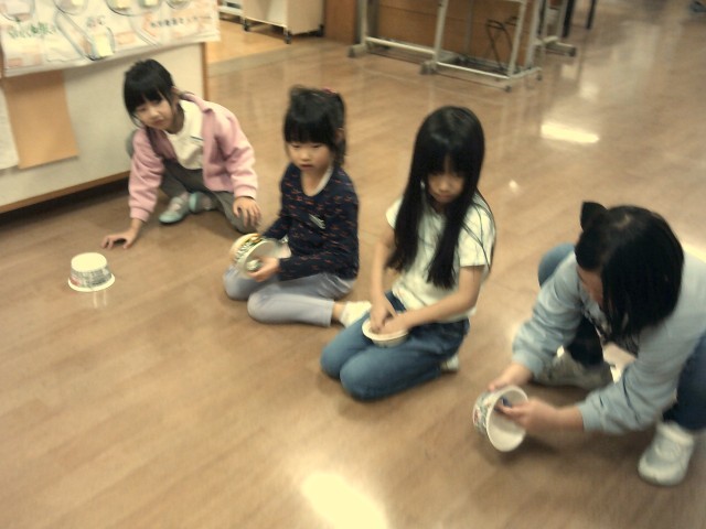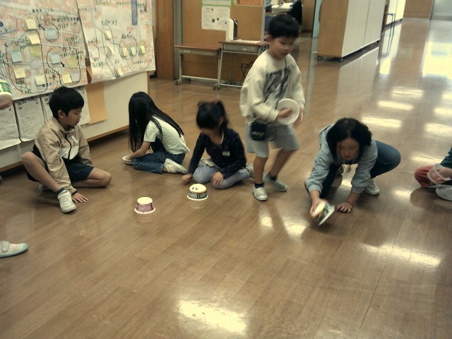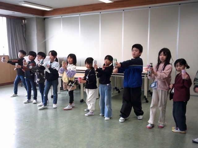 出来上がったおもちゃで遊びました。コトコト車を廊下で試して動きの面白さを感じる子供たちや、ストローアーチェリーやゴムロケットで友達と飛距離を競う子供たち等、それぞれに動くおもちゃの面白さを感じ取りました。これでお試し編が終わり、次はいよいよパワーアップ編へとすすみます。
